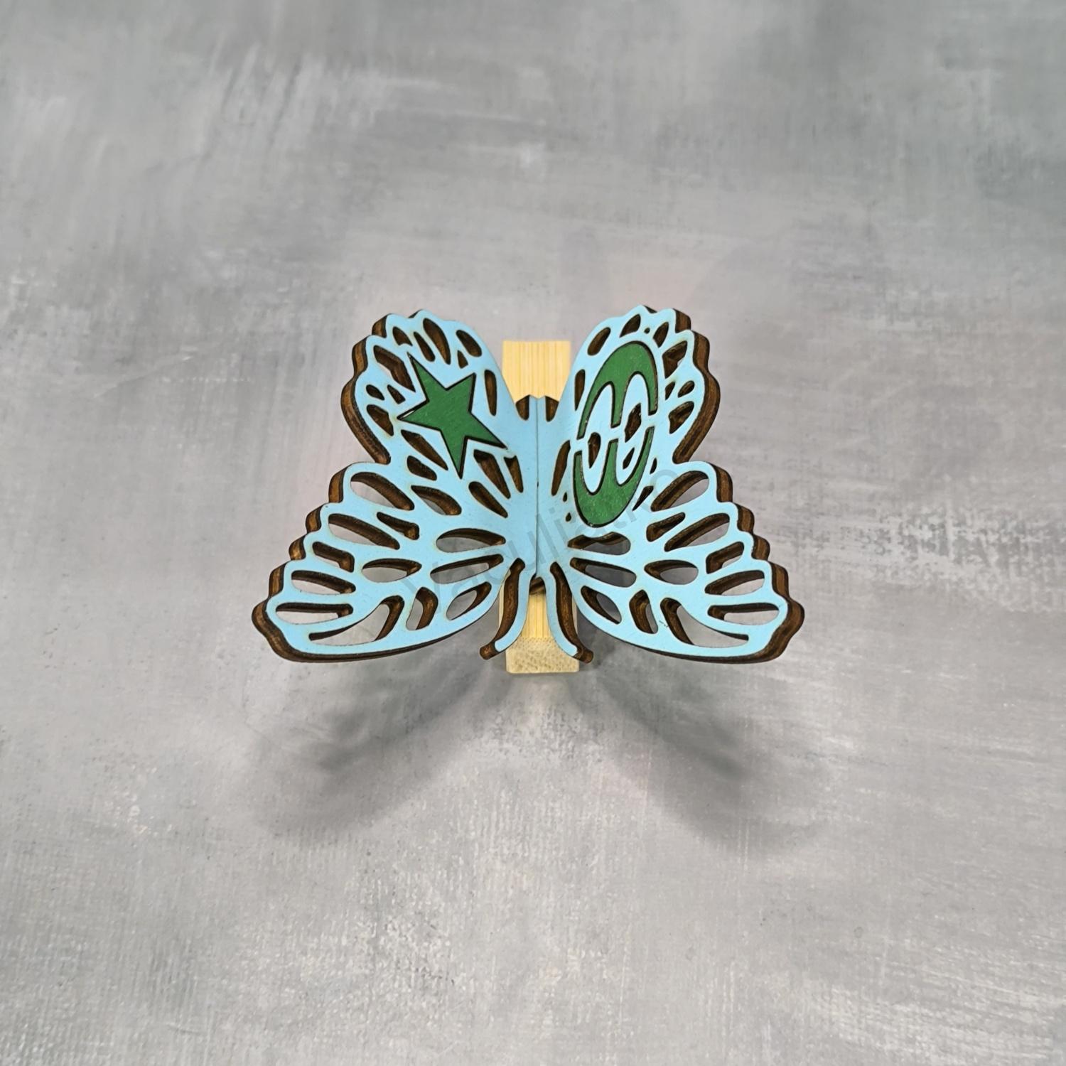 Úvod » Krídla » Drevený 3D motýľ 7cm, štipec, hviezda - znak (F-blankytná modrá, lepený, hr.3mm, v06)