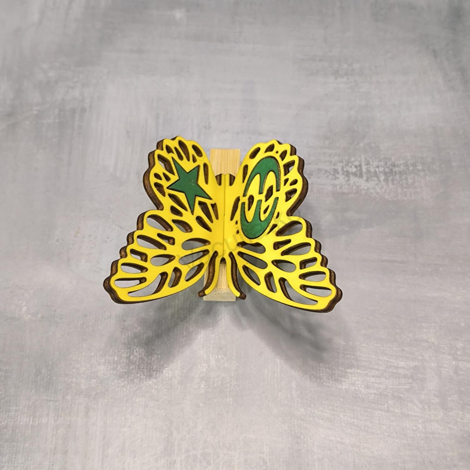Drevený 3D motýľ 7cm, štipec, hviezda - znak (F-žltá, lepený, hr.3mm, v09)