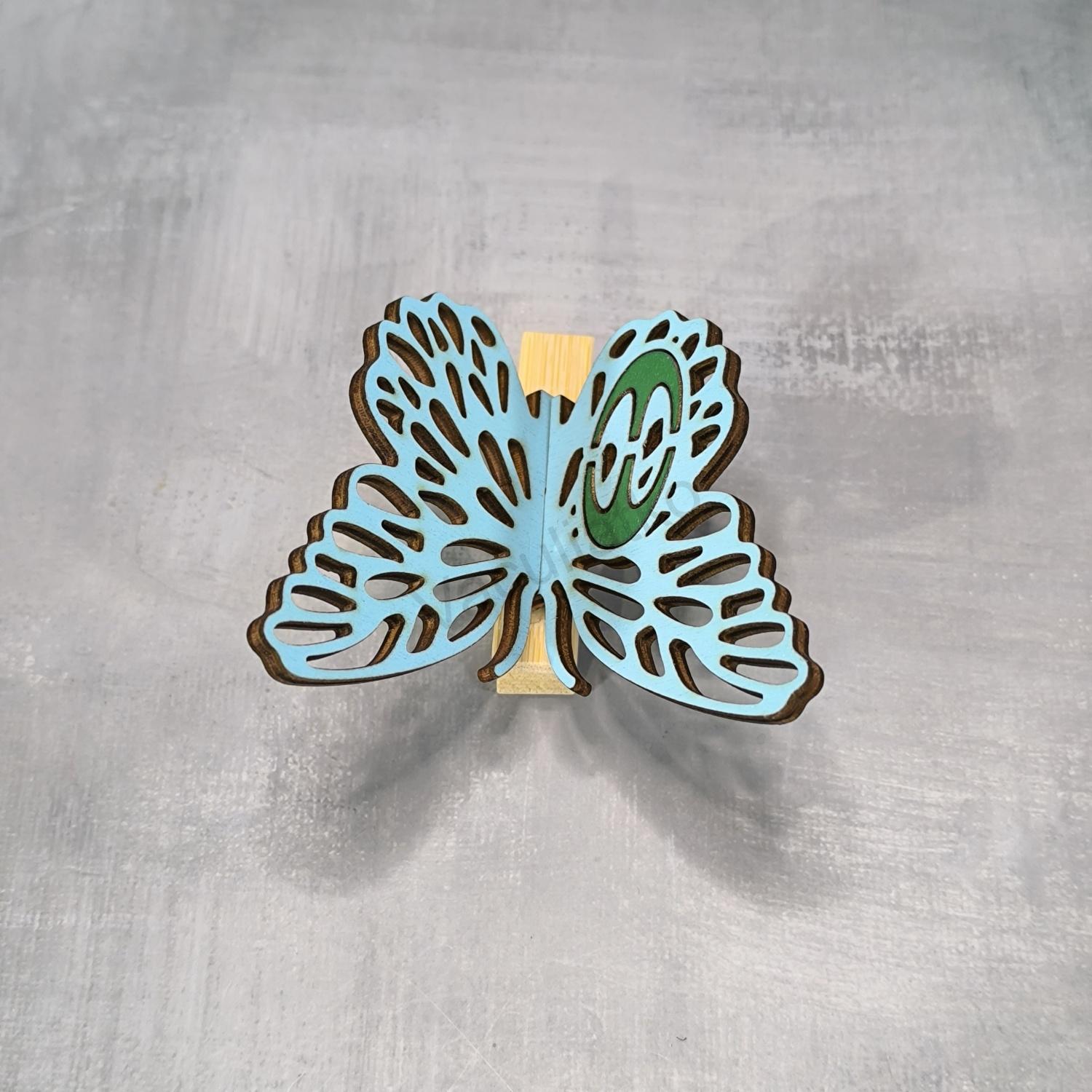 Drevený 3D motýľ 7cm, štipec, znak (F-blankytná modrá, lepený, hr.3mm, v05)