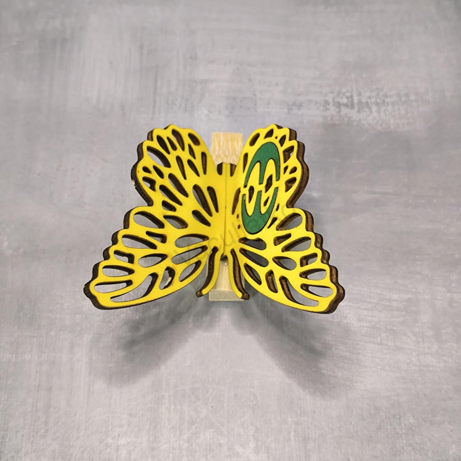 Drevený 3D motýľ 7cm, štipec, znak (F-žltá, lepený, hr.3mm, v08)