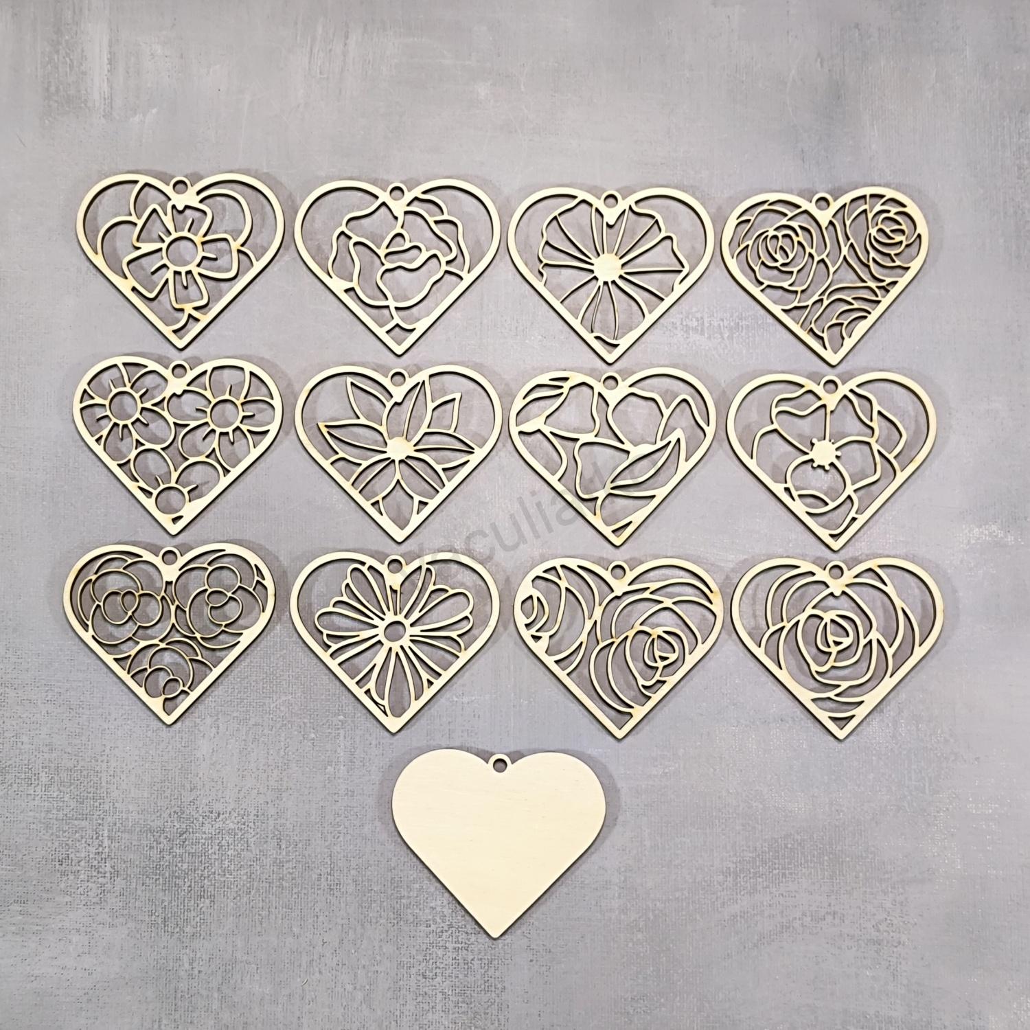 Drevený výrez - rezané srdce, kvet 7x6cm (ETS9, vzor 12)