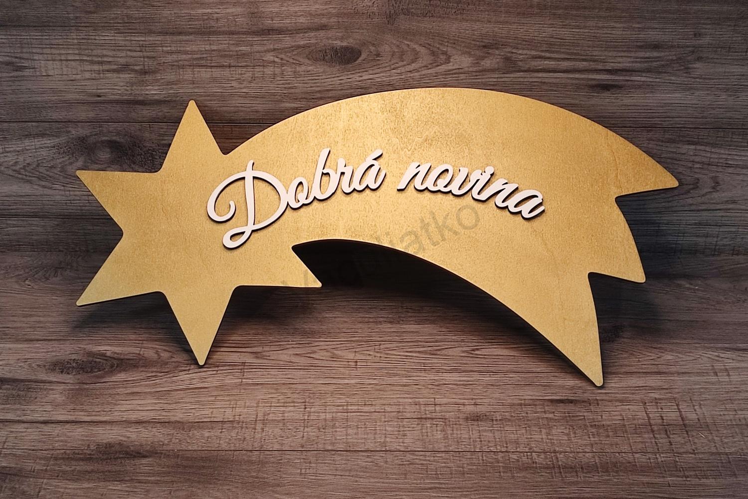 Úvod » Vianočné výrezy » Vianočná ozdoba kométa 60x30cm hr. 5mm zlatá + nápis Dobrá novina