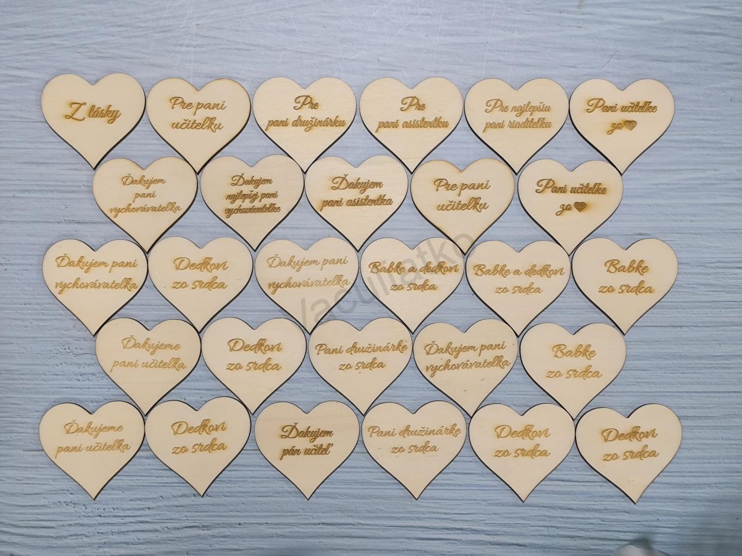 Výpredaj - drevený výrez srdce 6,5x6cm s textom 28ks