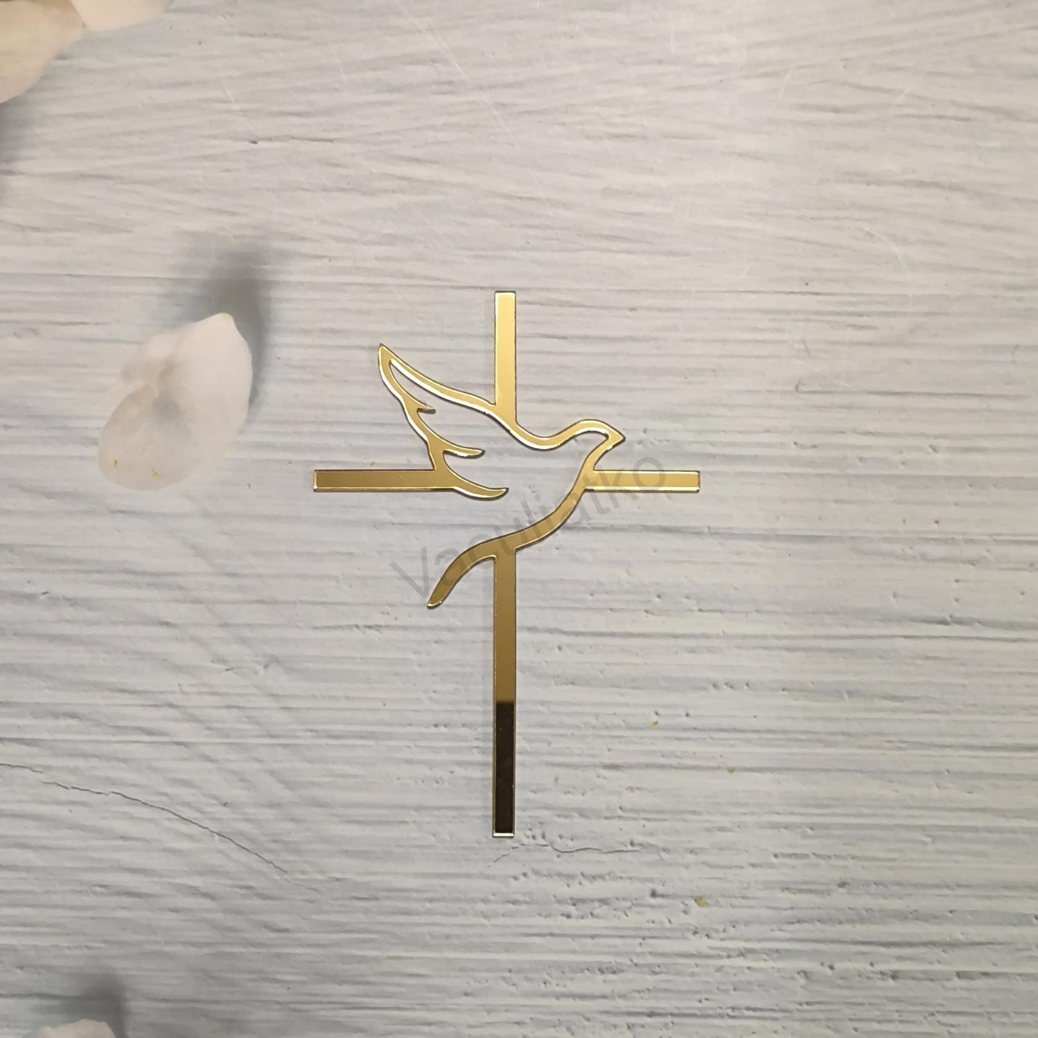Úvod » Nápisy na zapichnutie a iné. » Zrkadlové plexi - krížik 10x14cm holubica (F-zlatá, hr.2mm, úzky)